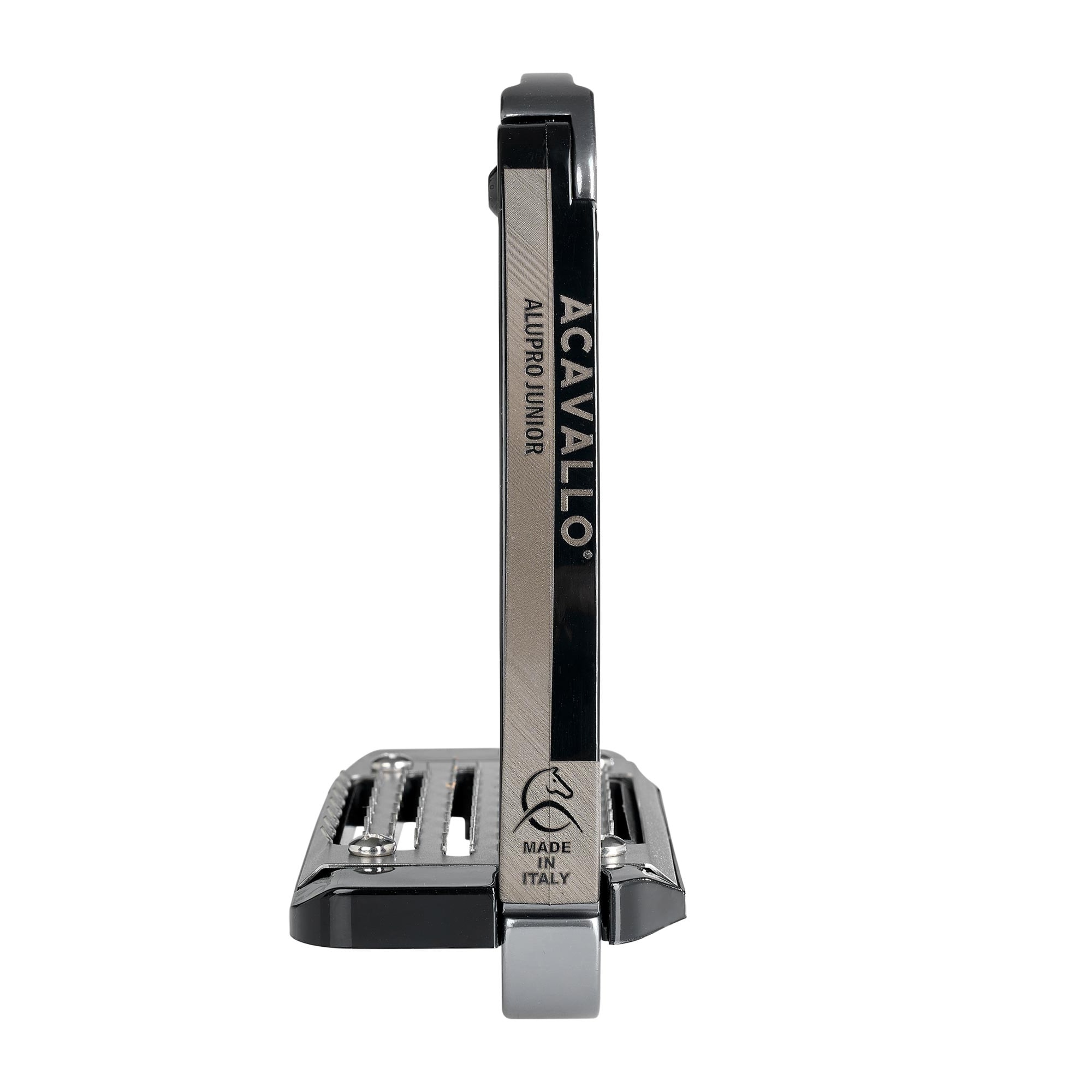 Acavallo Arena Safety Stirrup Junior, a lightweight and durable stirrup with patented side opening for extra security. Designed for young riders, featuring a wide tread for maximum grip and comfort.