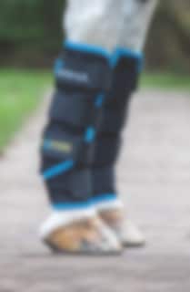 These cooling bandages are anatomically designed and made of neoprene with a durable surface. The inner core of neoprene dampens the force from interference and impact. The guards enclose the horse's legs tightly and they sit well in place thanks to the rotating block and a strong velcro fastening at the front.