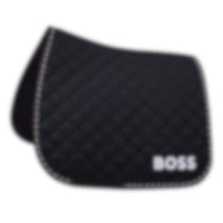 Dressage Saddle Pad Signature from Boss Equestrian is a high-quality dressage saddle pad made from moisture-wicking fleece with logo embroidery and signature-striped edging for optimal saddle position and style.