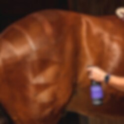 Spray an even layer of coat shine over the horse’s body, then groom with a body brush and curry comb. For an extra glossy finish—perfect for competition days—use a polishing mitt from EA Mattes.