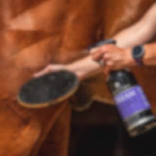 Spray an even layer of coat shine over the horse’s body, then groom with a body brush and curry comb. For an extra glossy finish—perfect for competition days—use a polishing mitt from EA Mattes.