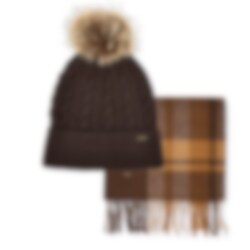 The Foley Set in Elk from Dubarry includes a cable-knit, cashmere-blend beanie with a faux fur pom-pom and a matching 100% wool check-patterned scarf. Delivered in an elegant gift box, it makes a perfect winter present.