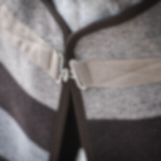 The rug features a stylish brown base with grey stripes and a neat brown piping, giving it a classic and timeless look. At the front, it is equipped with a practical buckle that ensures a secure fit. The wool rug also has a tail strap and the Mattes logo along the back. It is both durable and comfortable, making it an excellent choice for everyday use.