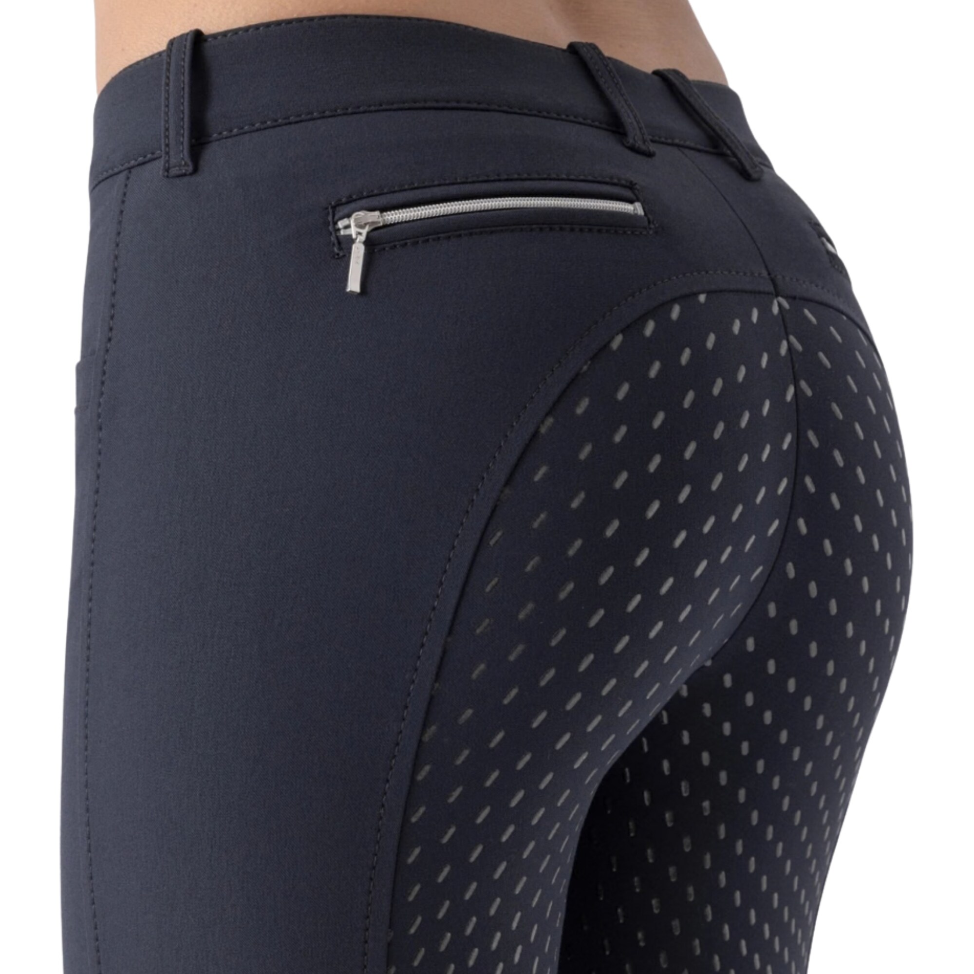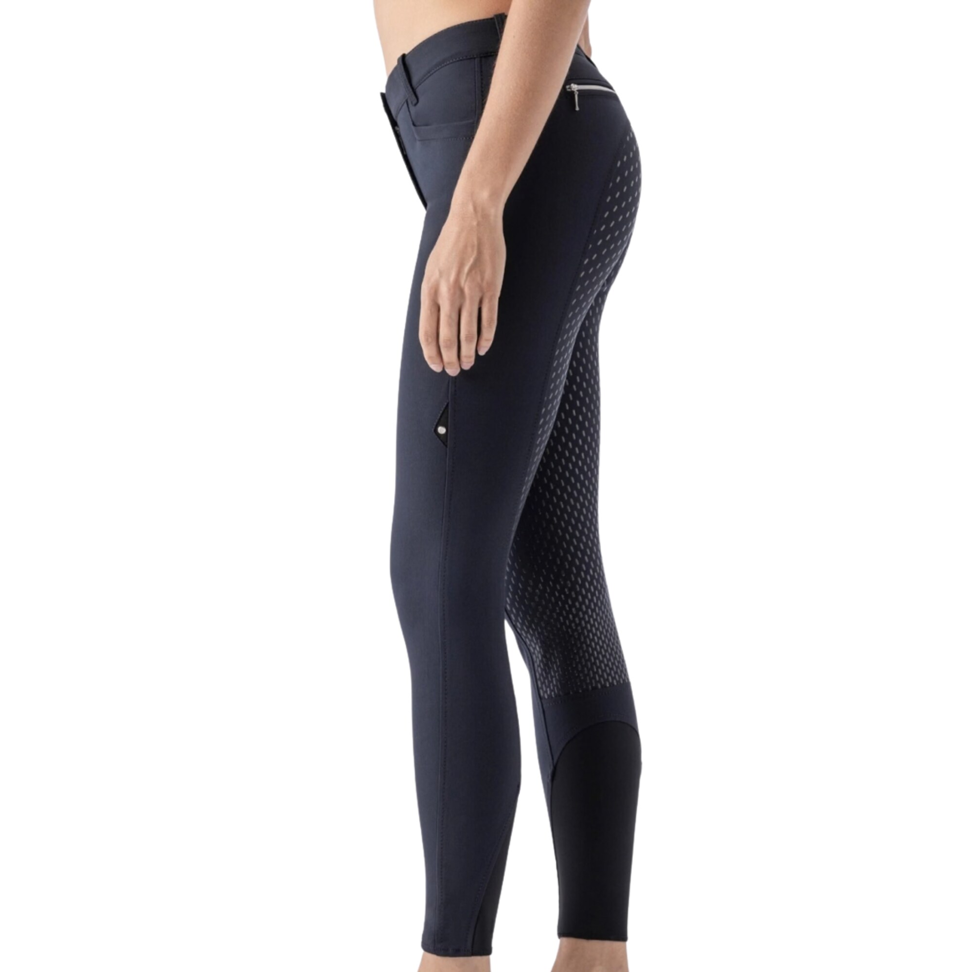 Elastic leg endings ensure a smooth fit inside riding boots without creating pressure. Two slanted front pockets and decorative zip pockets at the back complete the clean and balanced design.