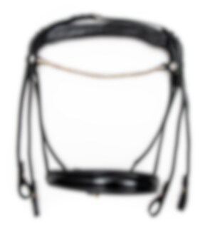 An anatomical and round sewn double bridle with a unique headpiece that prevents pressure and muscle damage in the horse's neck muscles.
