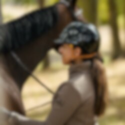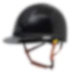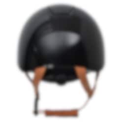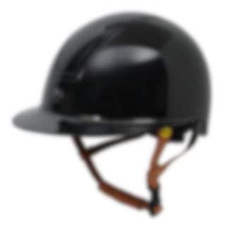 An elegant helmet from Hansbo Sport featuring the Multi-directional Impact Protection System (MIPS). The helmet has a visor, six ventilation openings, and a chin strap with three-point fasteners in brown synthetic leather with a quick-release buckle, as well as a soft tunnel for maximum comfort. The helmet has a sleek glossy finish with a shiny panel surrounded by subtle glitter.