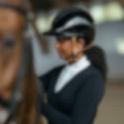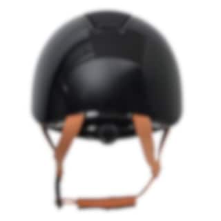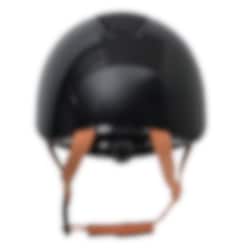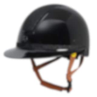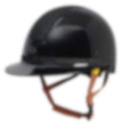 An elegant helmet from Hansbo Sport featuring the Multi-directional Impact Protection System (MIPS). The helmet comes with a visor, six ventilation openings, and a chin strap with three-point fasteners in brown synthetic leather with a quick-release buckle, as well as a soft lining for maximum comfort. It has a glossy finish with panel details in sparkling glitter and a beautiful glitter band around the visor.