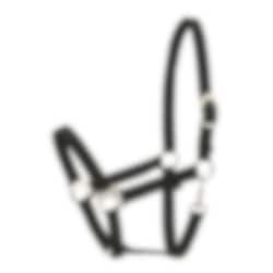 The halter is adjustable in the neck and has a neoprene lined inside. The halter has nickel-plated fittings and carabiner hook.