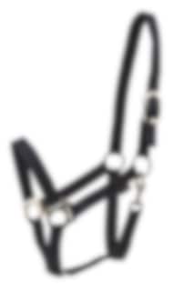 The halter is adjustable in the neck and has a neoprene lined inside. The halter has nickel-plated fittings and carabiner hook.