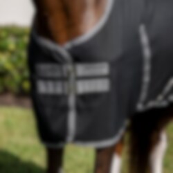 The rug offers a classic cut with a straight front closure, adjustable cross surcingles and a tail strap for a secure and stable fit – ideal for use in the stable, during transport or after training.