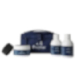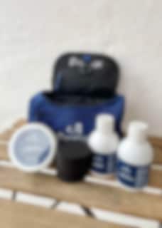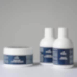 The leather care kit contains: Leather cleaner 300 ml, Leather balsam 300 ml, Leather oil 300 ml and two sponges.