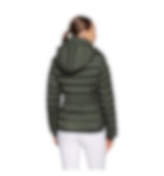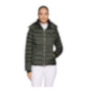 The jacket comes in a lovely green color that pairs perfectly with the gold-colored zippers. This versatile outerwear is not only functional in the stable but also stylish enough for everyday wear thanks to its elegant design.