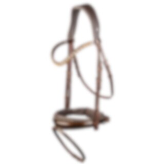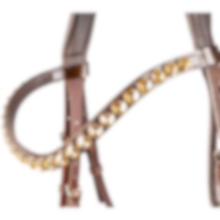 The Tokyo bridle is crafted in the color Chocolate with a flattering, patent noseband in Bronze Loom Patent and fine line piping in the color Met.Gold. The padding is in the color Negro. The beautiful curved browband is adorned with genuine Swarovski Rivoli XL stones, 12 mm in size, in the color Golden Shadow.