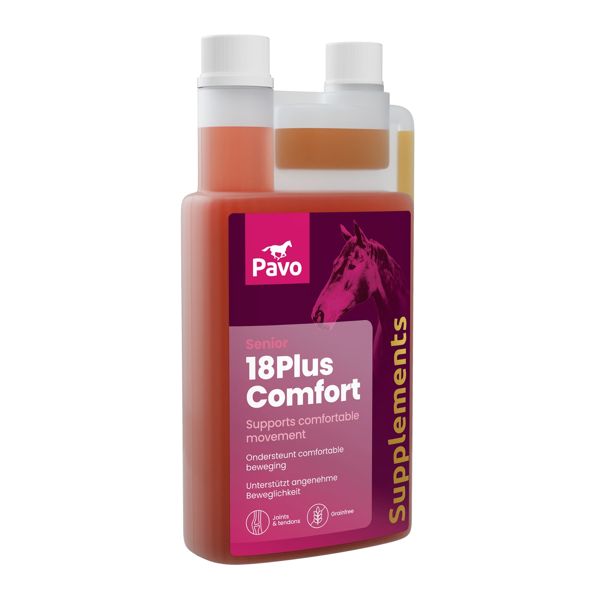 Pavo 18Plus Comfort 1L helps older horses move smoothly and comfortably by supporting joints and the musculoskeletal system. A balanced combination of well-known ingredients promotes the horse’s mobility and overall comfort.