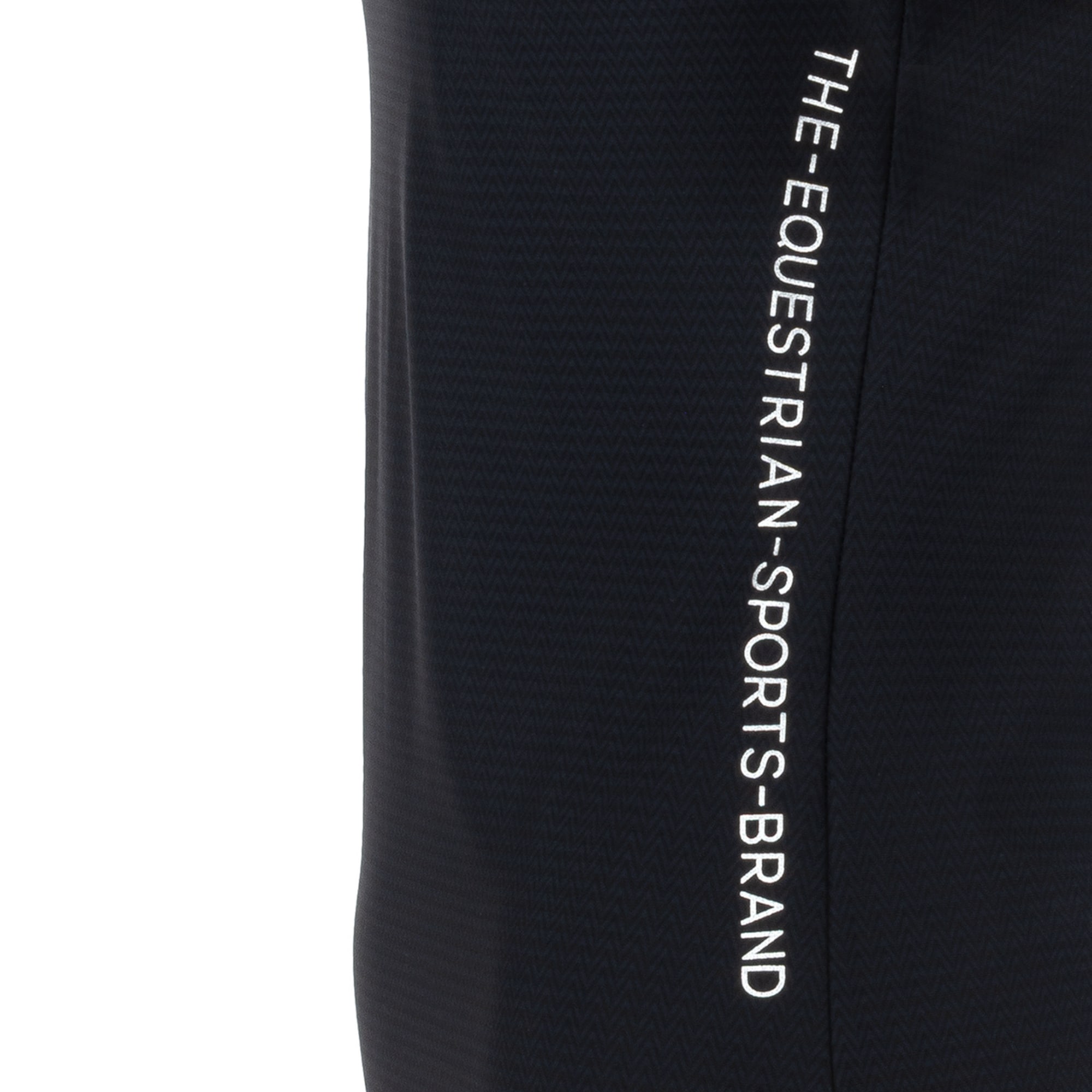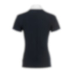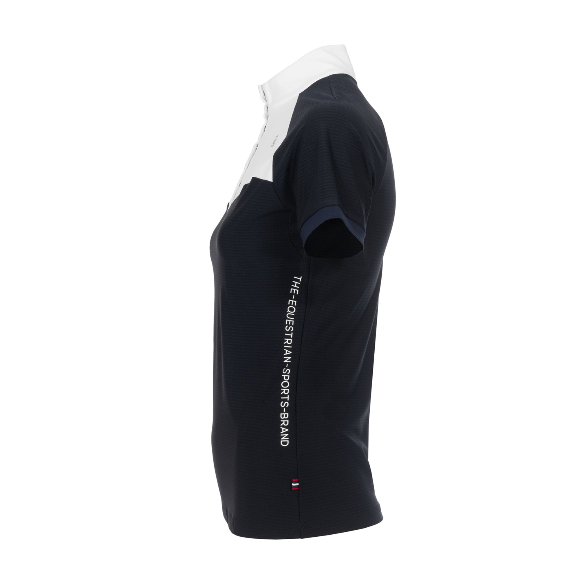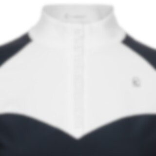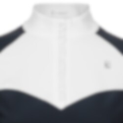 The competition shirt features short sleeves with soft jersey cuffs and a front fastening with concealed press studs, decorated with crystal stones. On the left chest, there is a Cavallo print in silver stones. The material is breathable, quick-drying and developed to be odour neutral.