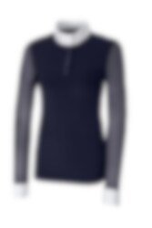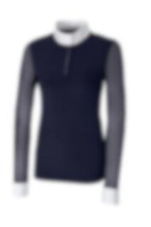 With this competition shirt from Pikeur you will guaranteed be the prettiest on the competition site. Elonie Competition Shirt comes in a beautiful navy blue color with a white collar with Pikeur written with small crystals and white cuffs with hidden press studs. The shirt has mesh sleeves for best comfort on hot summer days. You can easily open up the collar with hidden buttons at the front that are adorned with crystals.
