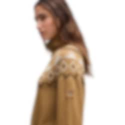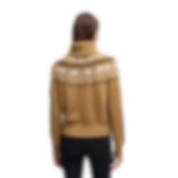 The jumper comes in a classic camel shade and is decorated with a Norwegian-inspired pattern that adds a timeless and stylish touch. With its ribbed turtleneck, cuffs, and hem, the garment ensures a good fit and extra comfort.