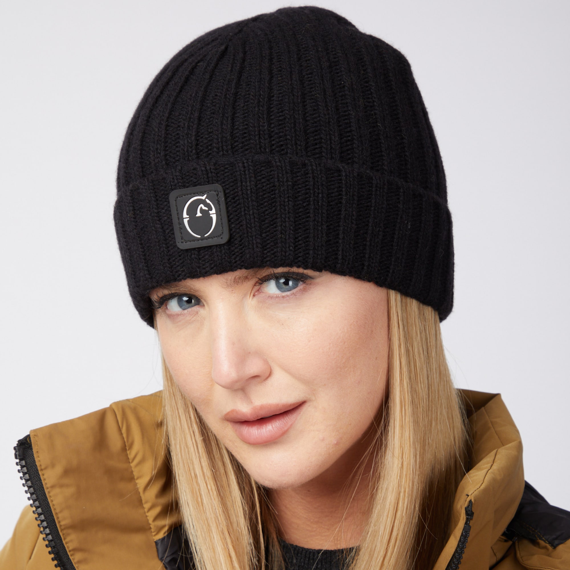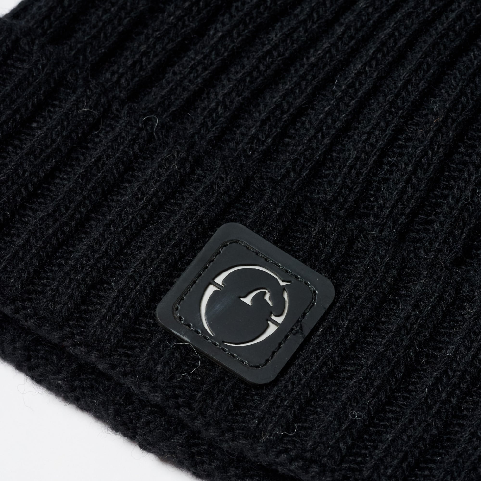 Rib-knit beanie in soft yarn with a folded cuff and leather Vestrum logo on the front. Sleek black design suitable for both everyday wear and the stable.