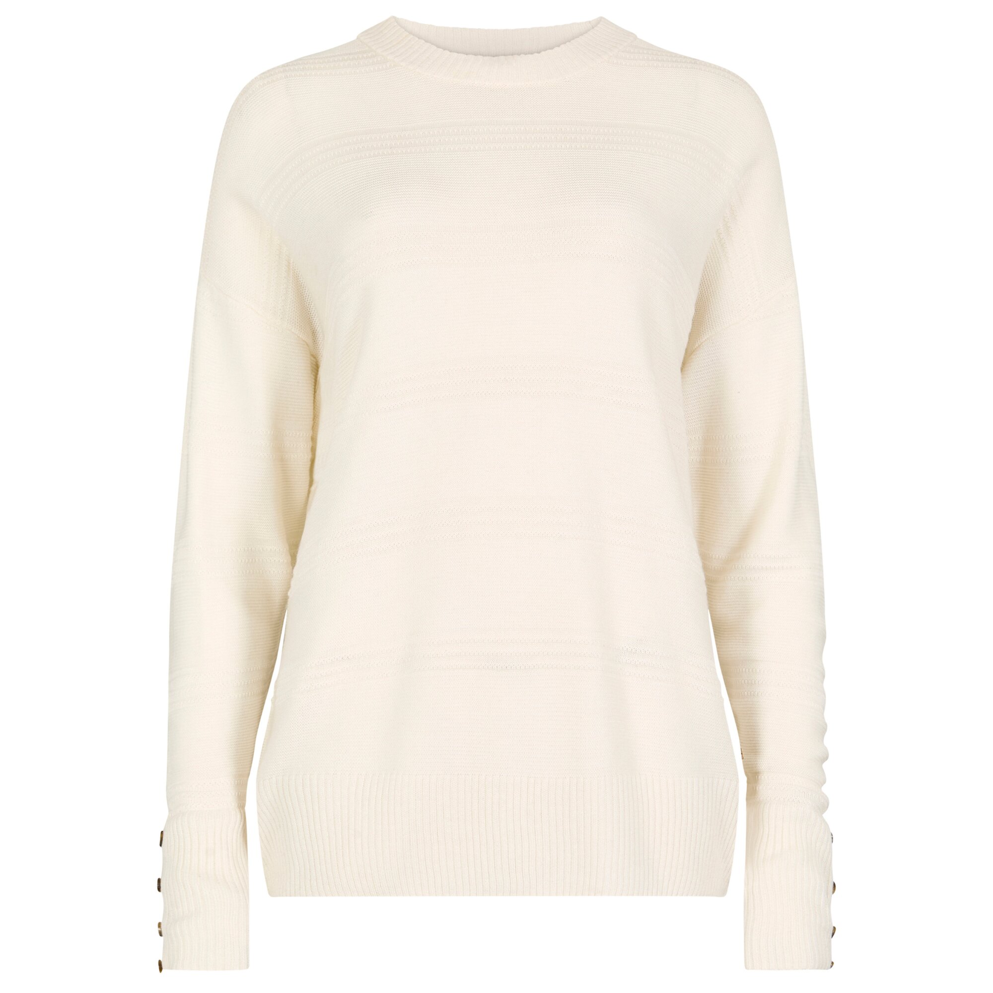 Dubarry Ashfield is a classic knitted sweater with a crew neckline, designed with a relaxed fit and dropped shoulders for a modern silhouette. The Ashfield knit features buttoned cuffs and subtle textured stripes running throughout the garment.