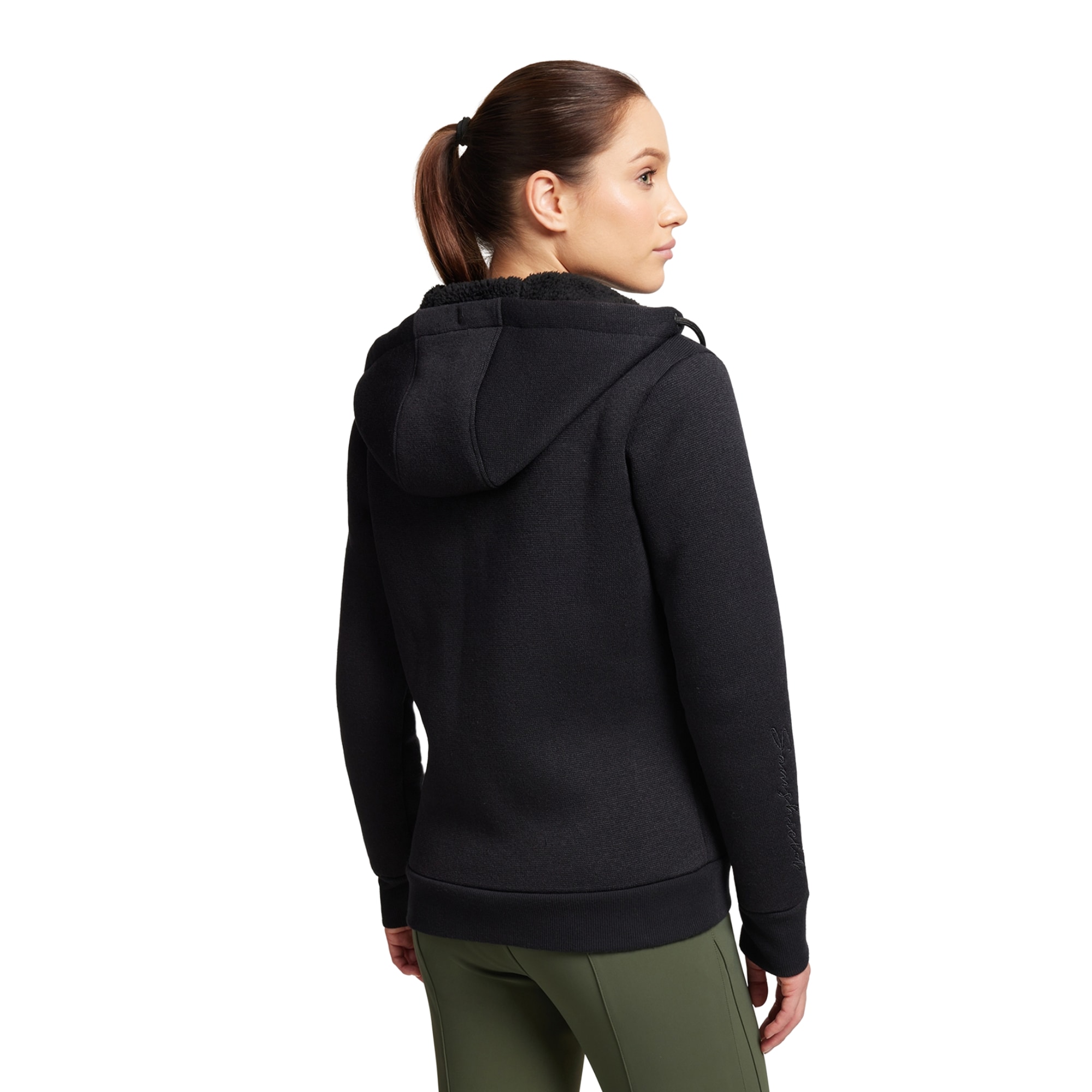 Sporty Fouzia Sweatshirt in black from Samshield, featuring a hood, stand-up collar, and subtle crystal details. Made from soft, stretchy fabric that provides warmth, wind protection, and easy care, perfect for riding and everyday wear.