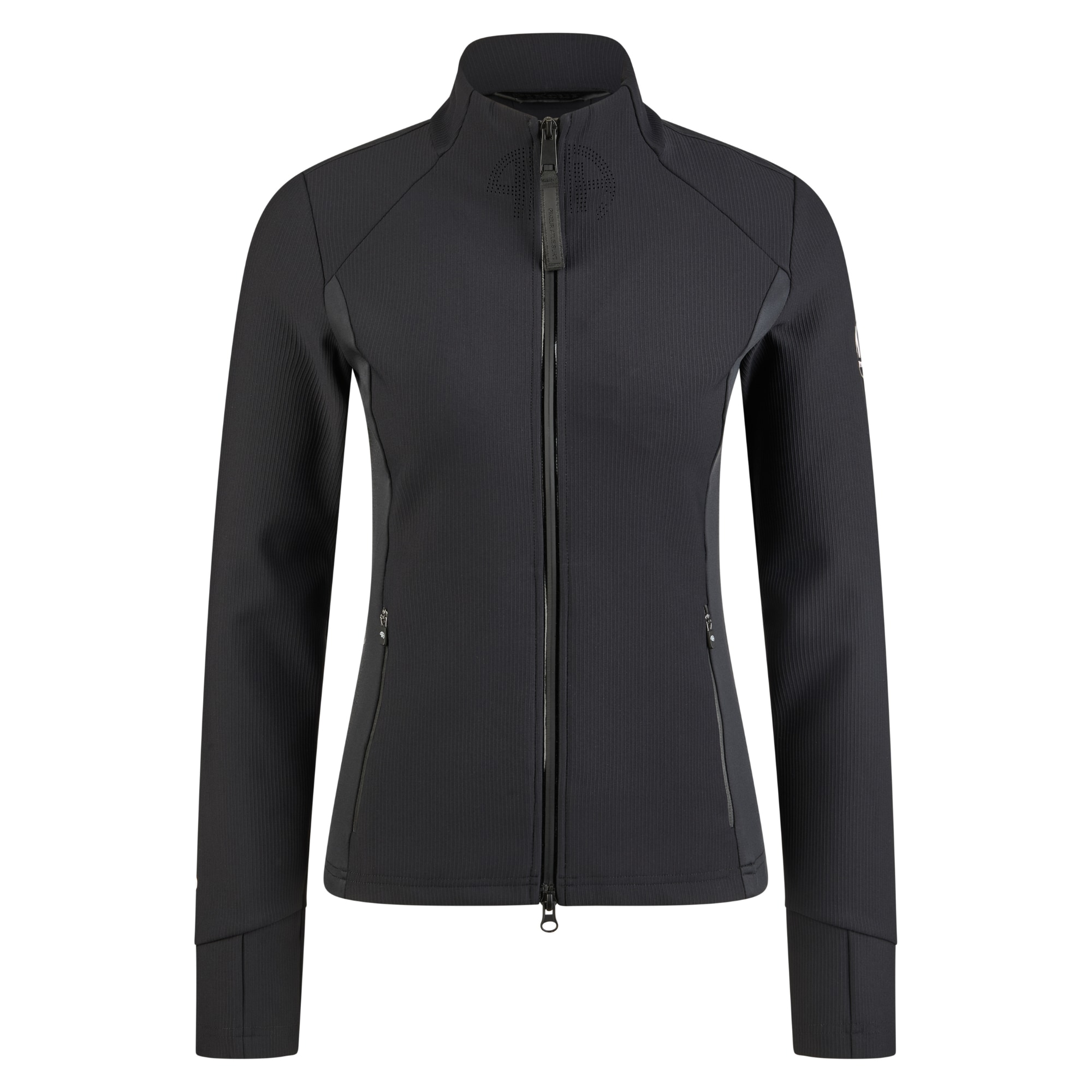 Function Jacket from Pikeur made from ribbed material with a stand-up collar and a close-fitting silhouette. The garment is produced in a material mix where the ribbed fabric has a soft surface, combined with solid-colour side panels with perforation for increased ventilation.