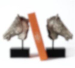 Two sculptures in the shape of horse heads that can be used as bookends. They will make sure to have the books in place in a practical and nice way. Material: Polyresin Size: 27 cm X 7 cm X 21 cm.