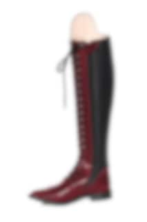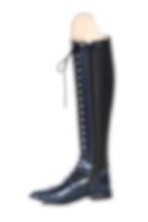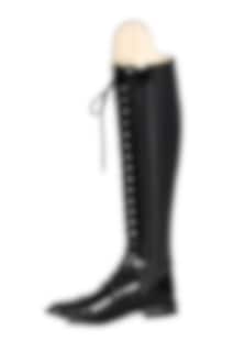 The unique feature of this model is the discreet front zipper placed next to the lacing, making the boot easy to put on and take off while accentuating the natural lines of the leg. The zipper is an Opti type with an internal spindle, providing minimal visibility, long-lasting durability, and reduced dirt accumulation. The inside of the calf is always lined with black grip leather for optimal stability and close contact with the horse.