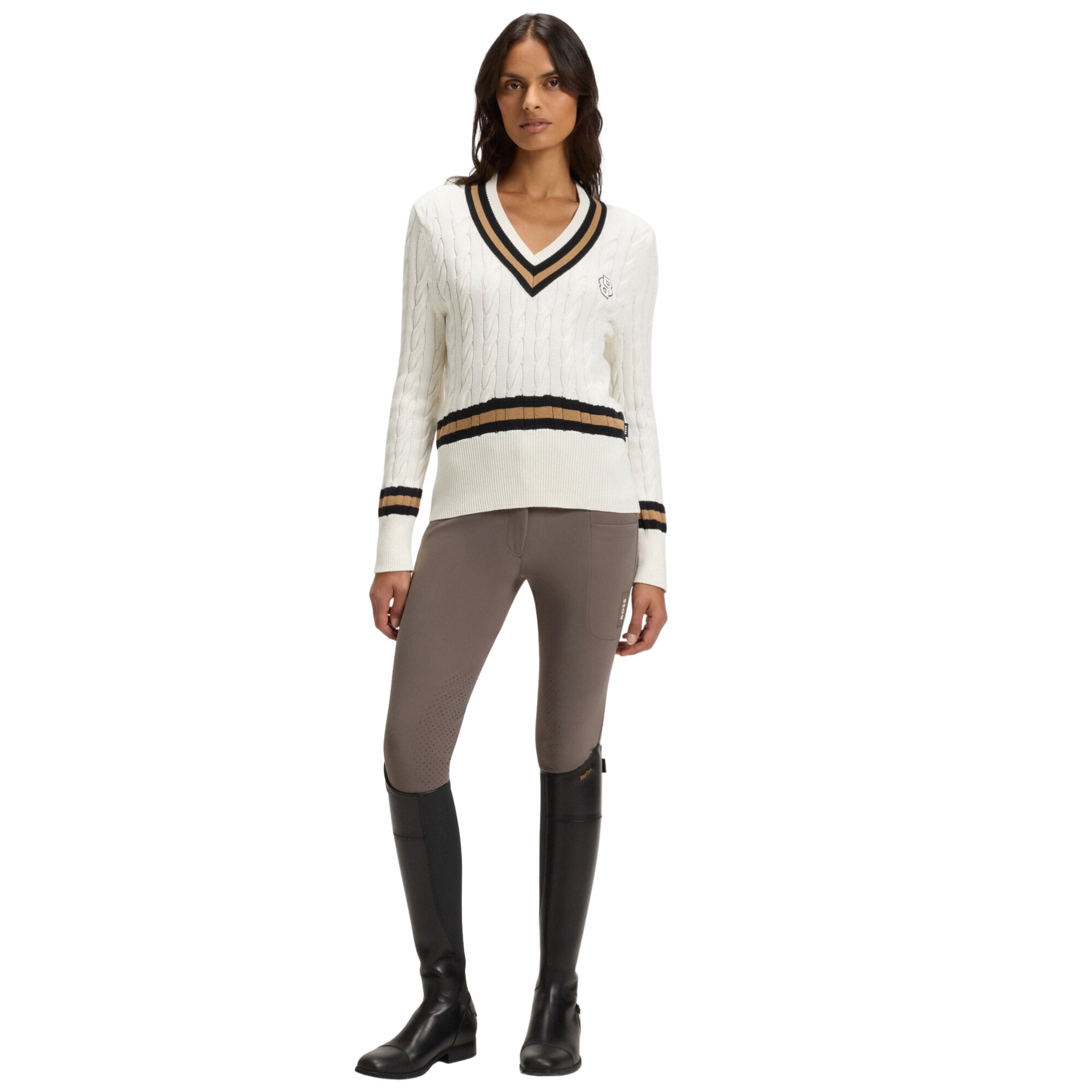 The Hannah riding breeches from Boss Equestrian are modern, high-performance breeches with a high waist, a subtle BOSS logo on the left leg and a practical phone pocket. The breeches are made from an ultra-light, super-stretch fabric with ergonomic silicone knee grip and a material that is breathable, quick-drying, anti-pilling and easy to care for. They also feature SPF 50 for added protection during outdoor activities.
