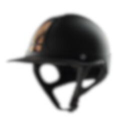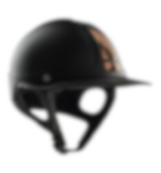 The helmet's black shell with a satin-like finish, combined with copper-colored details, creates a sophisticated impression.