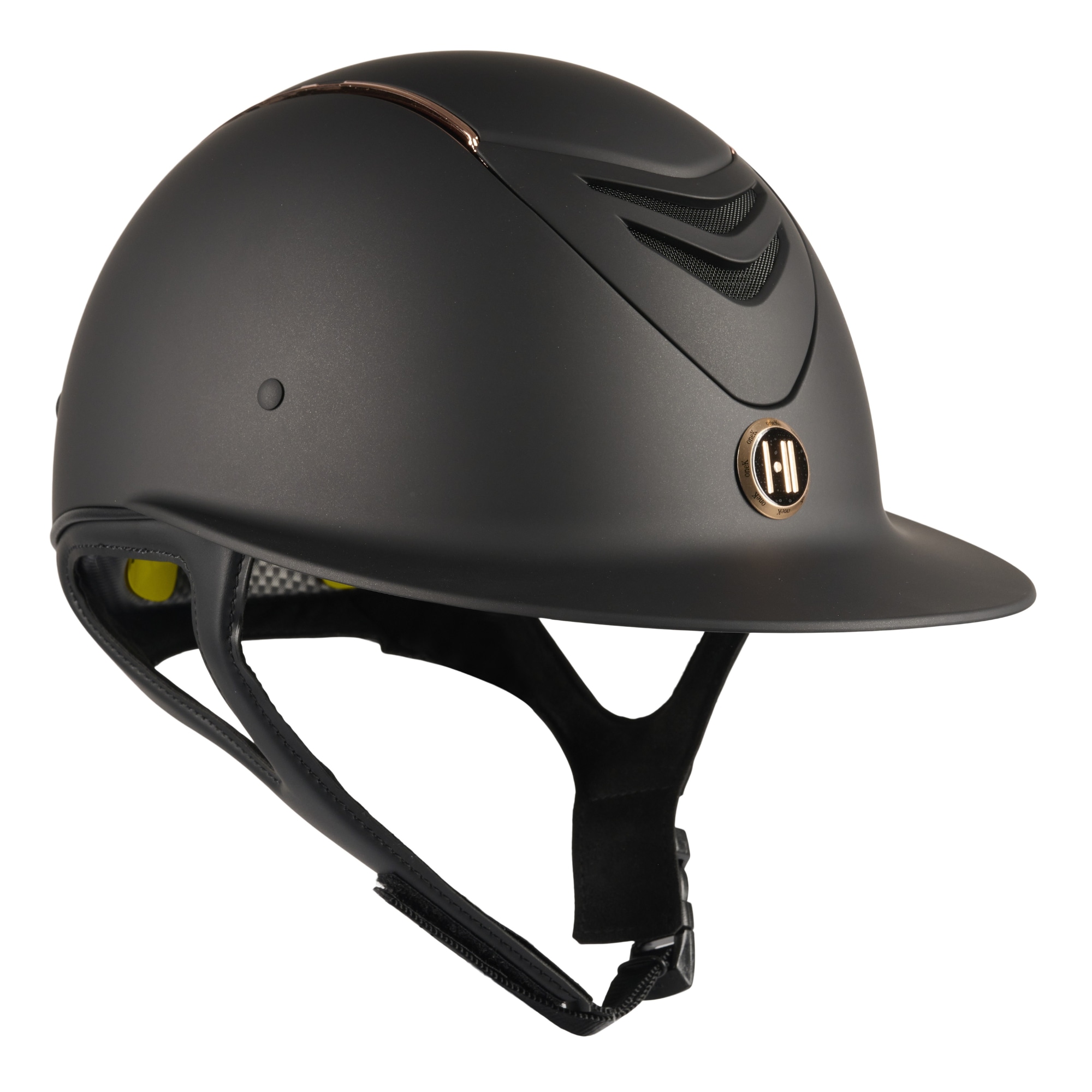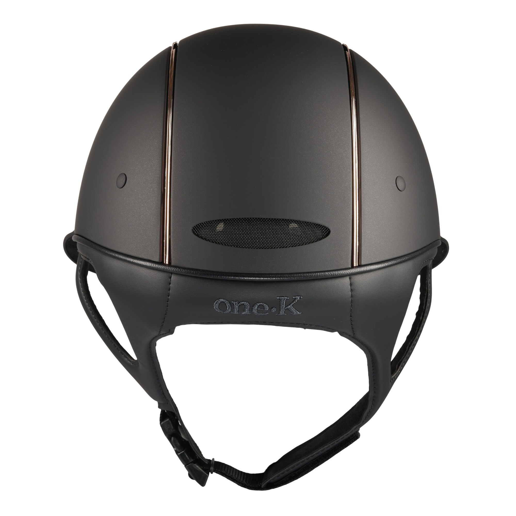 This OneK riding helmet features a matte black finish with elegant rose gold details that create a clean, refined contrast. The visor provides effective protection from sunlight and enhances the helmet’s elegant shape.