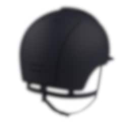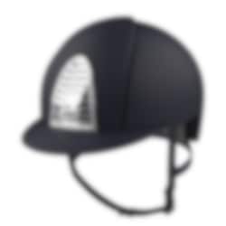 The riding helmet Cromo 2.0 Textile Swarovski® has a navy blue varnished matt shell, front, rear and visor. Chrome frame with Swarovski® Crystal, chrome grid, sub-grid and button, navy blue leather chinstrap. Cromo 2.0 has an innovative mechanical system that allows the rider to change the color and design on both the front and rear to adapt the helmet to his own taste and liking.