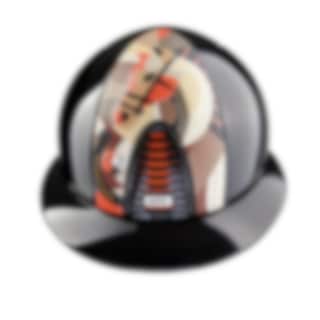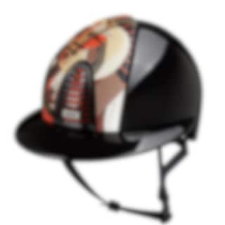 The riding helmet Cromo 2.0 Polish has a glossy shell with a front in the unique Orange Pegasus pattern in orange, glossy black visor, shiny black frame and grid, with a matching orange subgrid.