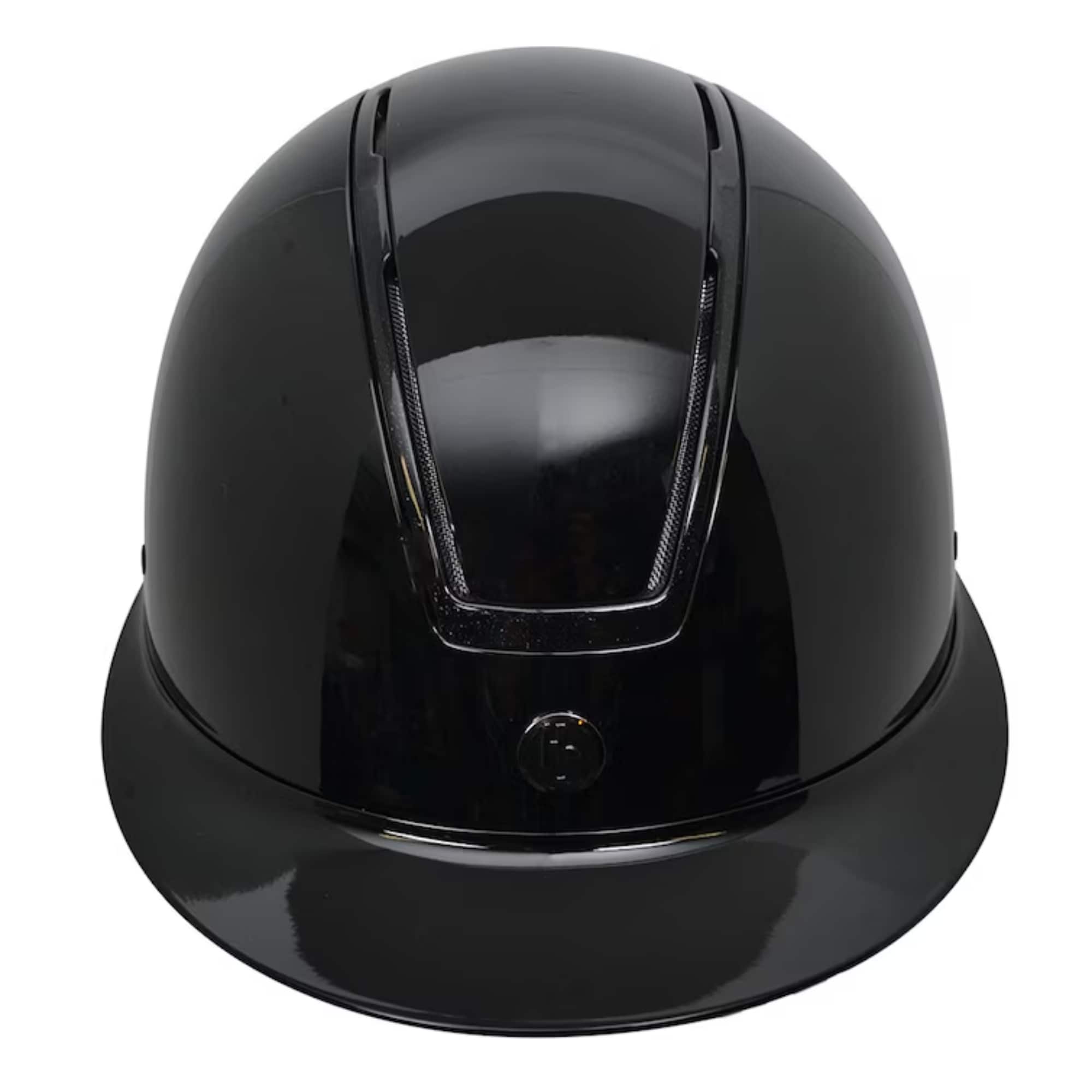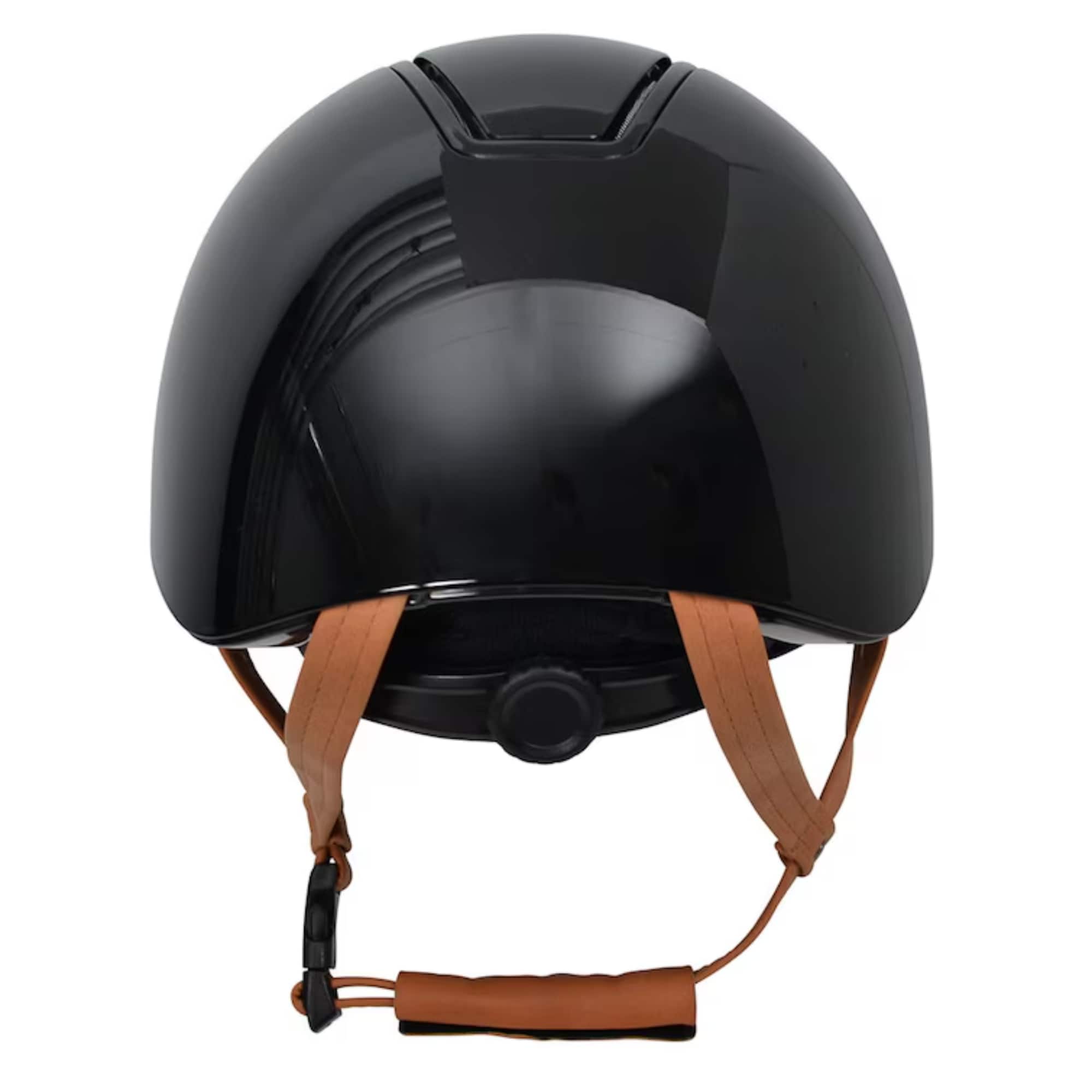 An elegant helmet from Hansbo Sport featuring the Multi-directional Impact Protection System (MIPS). The helmet has a visor, six ventilation openings, and a chin strap with three-point fasteners in brown synthetic leather with a quick-release buckle, as well as a soft tunnel for maximum comfort. The helmet has a sleek glossy finish with a shiny panel surrounded by subtle glitter.