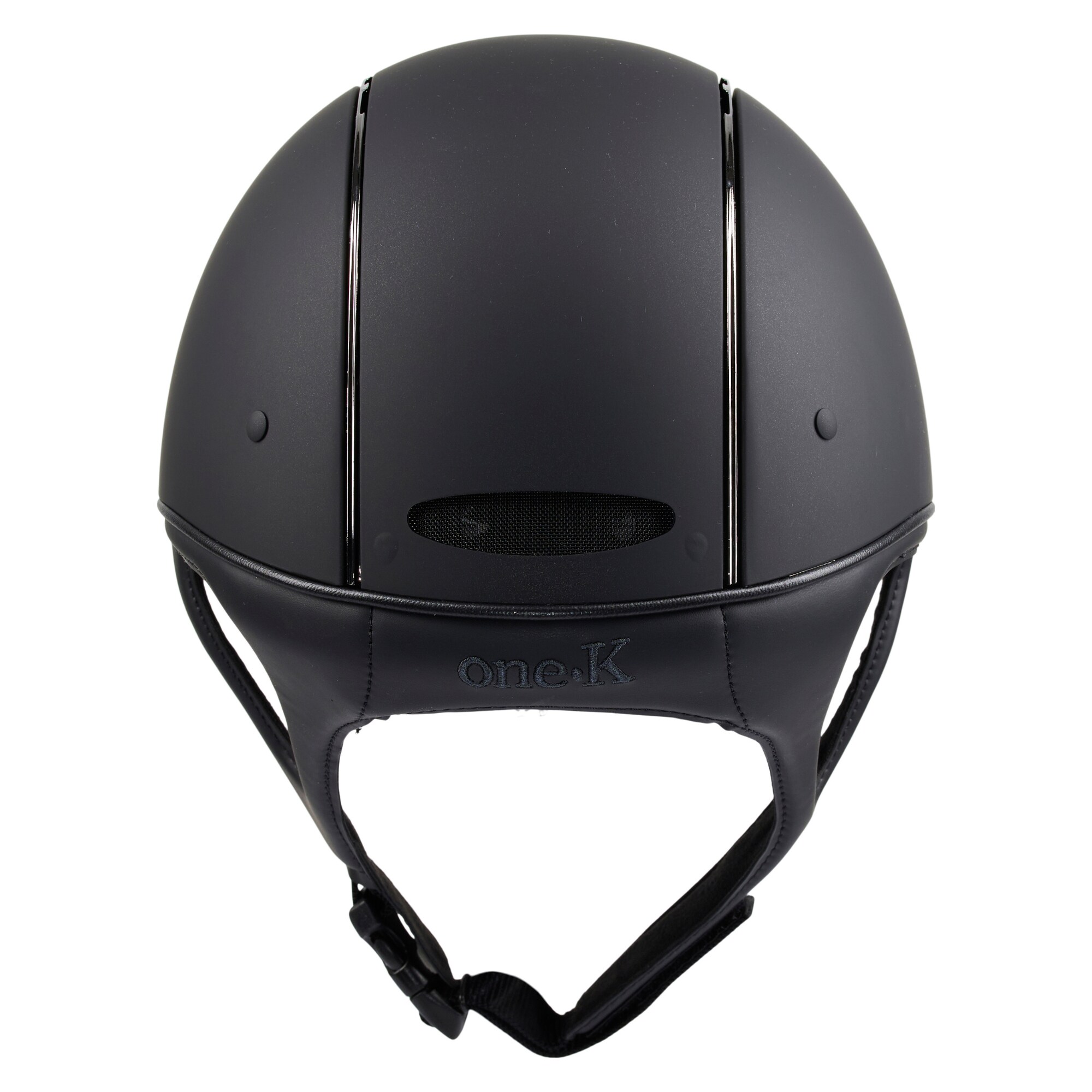This OneK riding helmet features a matte black finish with subtle chrome details for a clean, stylish look. The MIPS Brain Protection System provides increased protection against rotational forces.