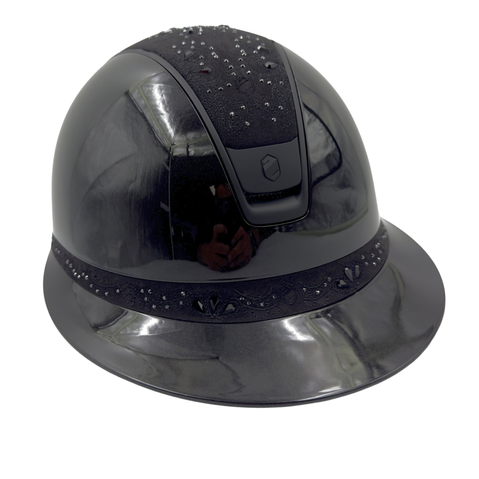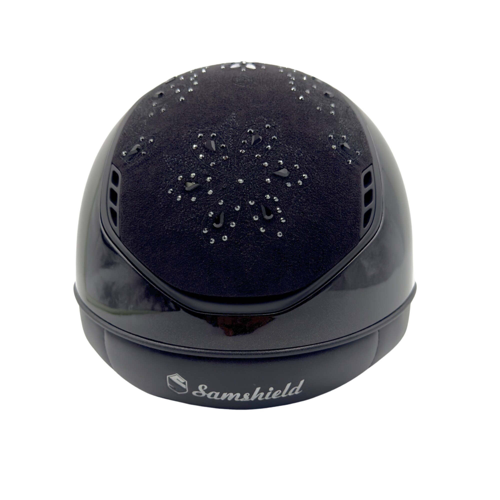 Beautiful riding helmet Miss Shield 2.0 with a long visor from Samshield, designed in a glossy finish with top in and frontal band in black Crystal Bloom!