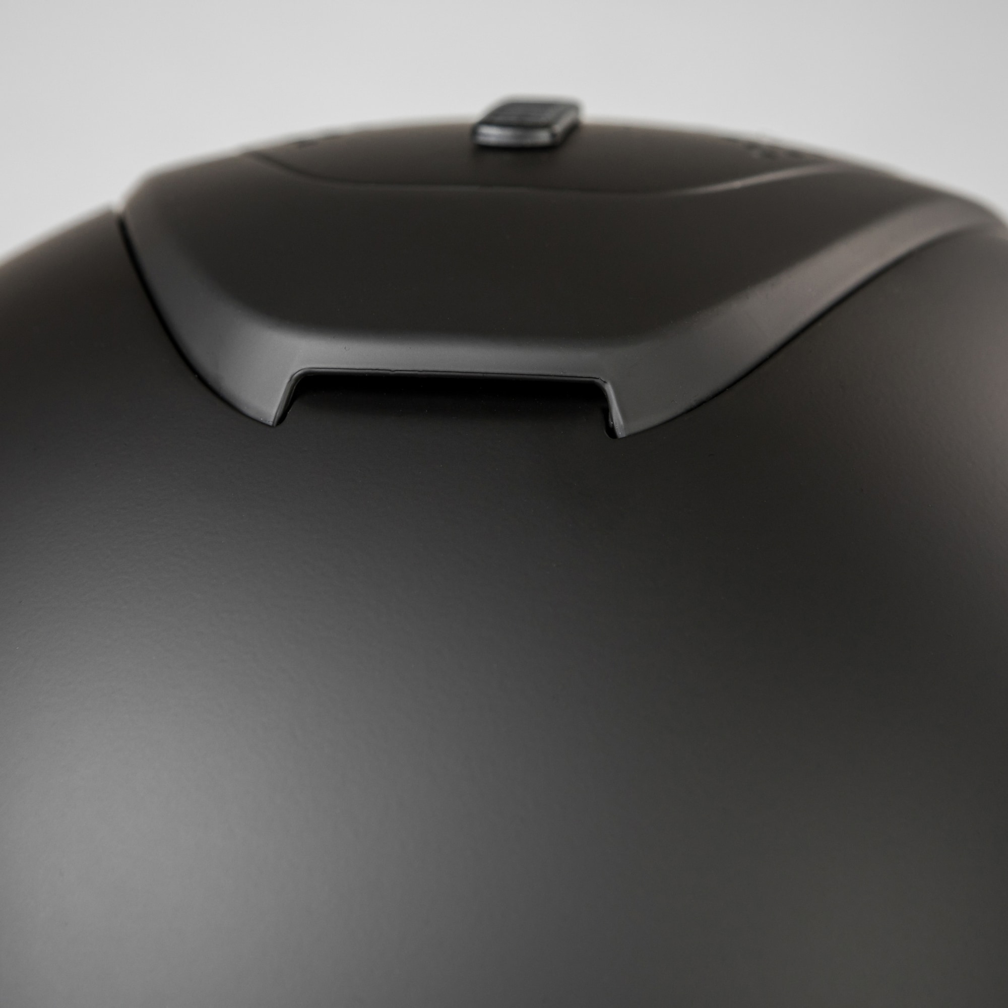 The ventilation system consists of integrated air channels that allow air to circulate through the helmet, with airflow regulated via openings at the top.