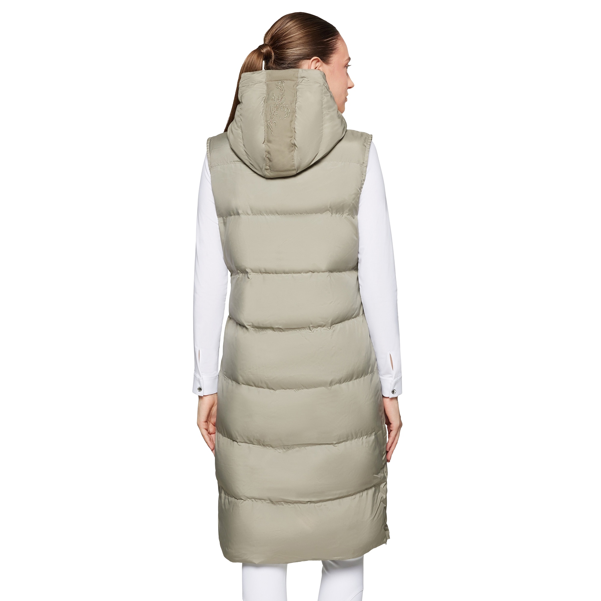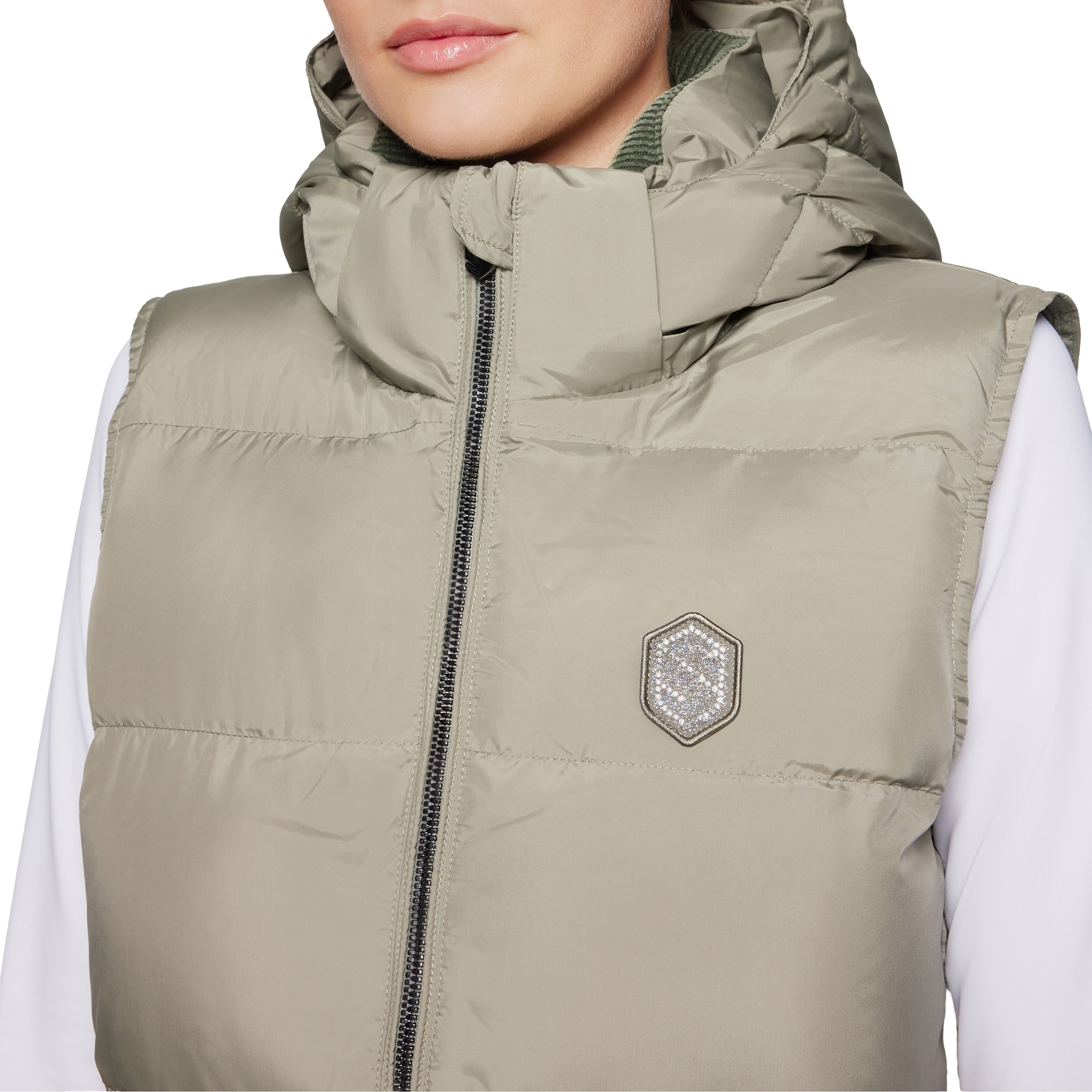 The Elea Puffer in Patine from Samshield is a long, sleeveless vest with a removable hood and a Samshield blazon in Swarovski® crystals, perfect for riders who want to combine style and functionality.