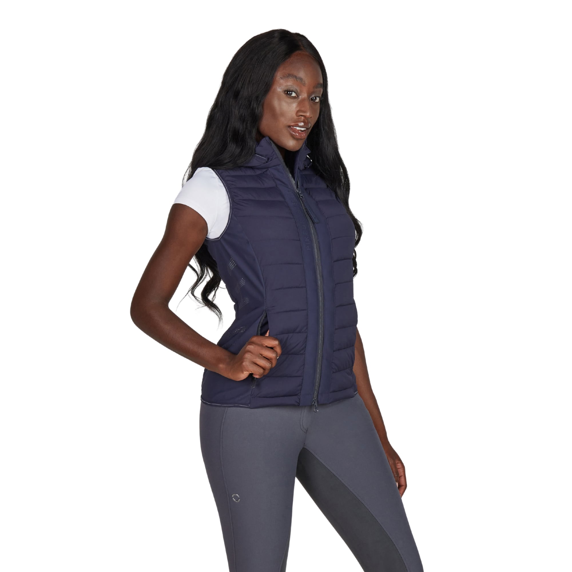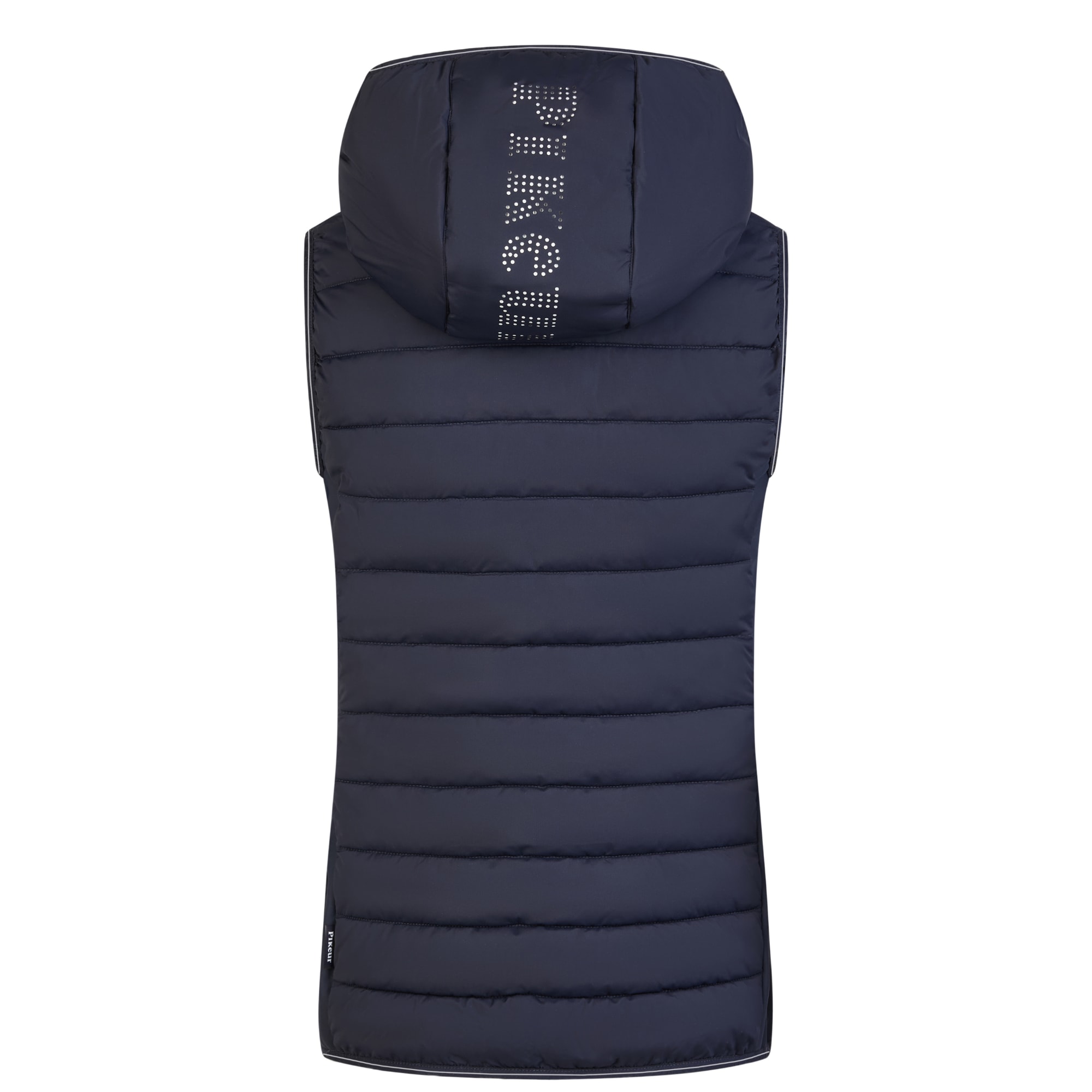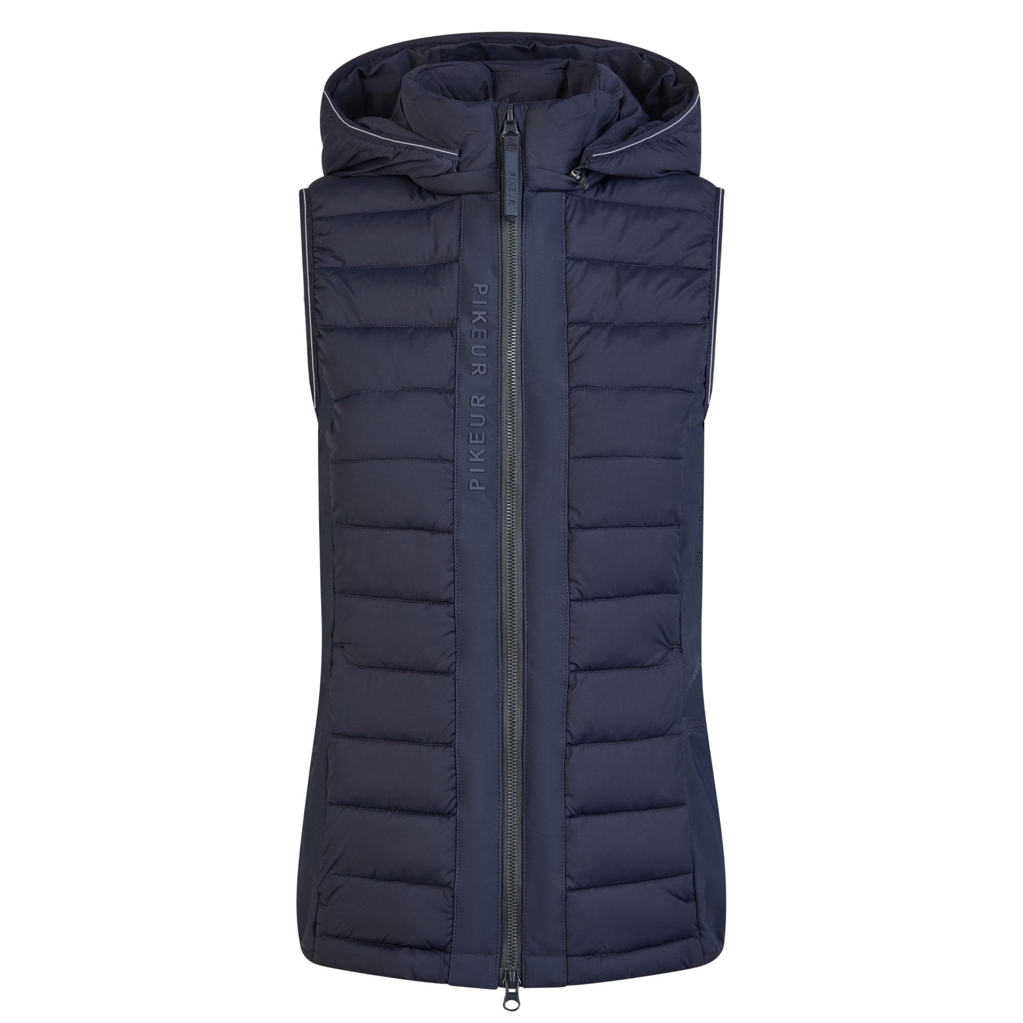 The vest fastens with a 2-way front zip and features concealed zip side pockets for a clean overall finish. The hems and edges are finished with tone-on-tone binding featuring a Pikeur print. Inside, a printed pictogram illustrates the vest´s functional properties.