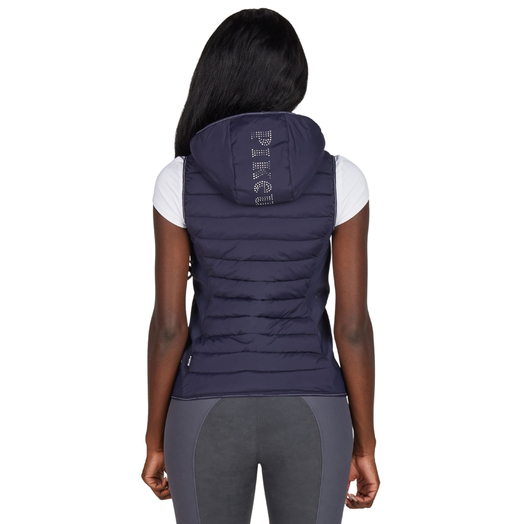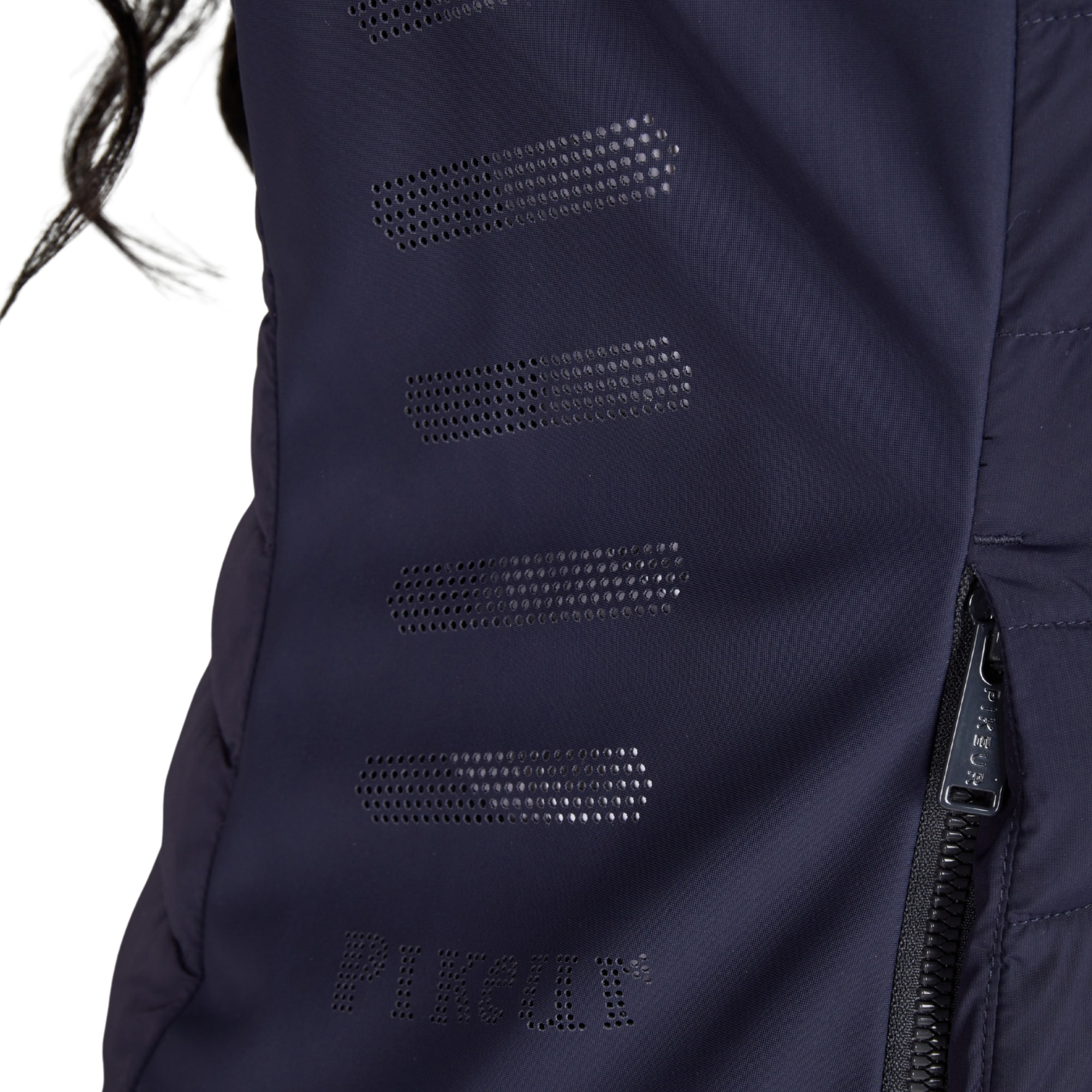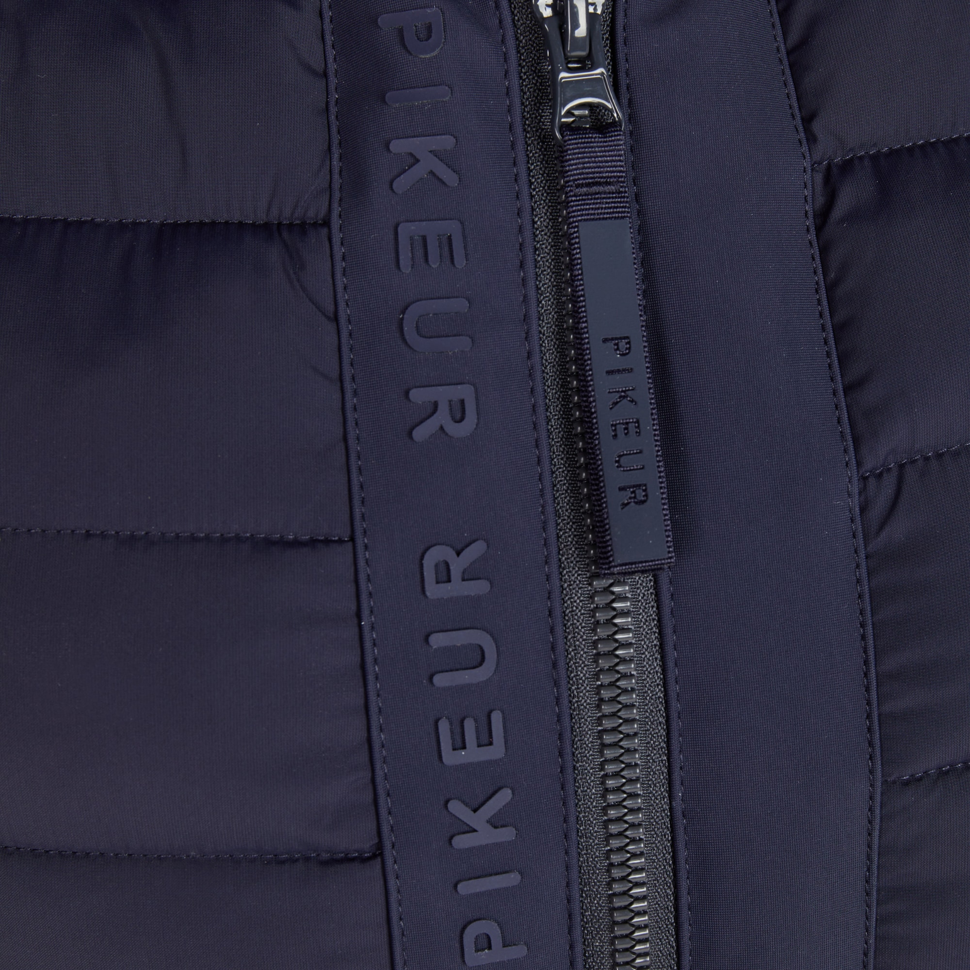 The vest fastens with a 2-way front zip and features concealed zip side pockets for a clean overall finish. The hems and edges are finished with tone-on-tone binding featuring a Pikeur print. Inside, a printed pictogram illustrates the vest´s functional properties.