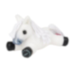 Panda is a light grey, fluffy soft pony with a smooth, plaitable light mane and tail. With round, dark eyes and a relaxed lying-down pose, Panda feels just like a little foal companion to take everywhere.