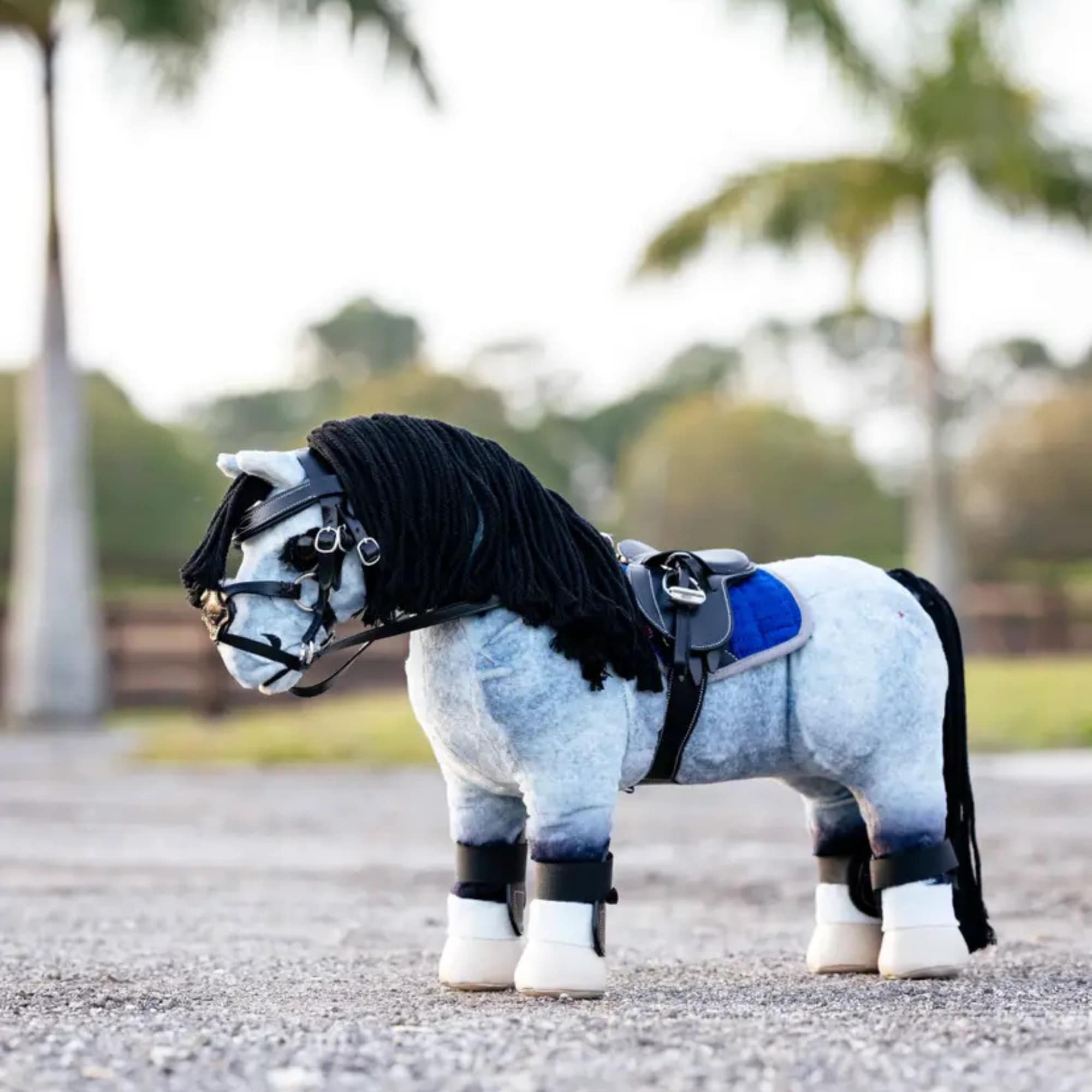 This jumping saddle for LeMieux Toy Ponies is beautifully crafted with fine details, providing a more fun and authentic play experience. The saddle features a forward-cut design, detailed white stitching, and realistic stirrups, and comes with a matching anatomical stud girth.