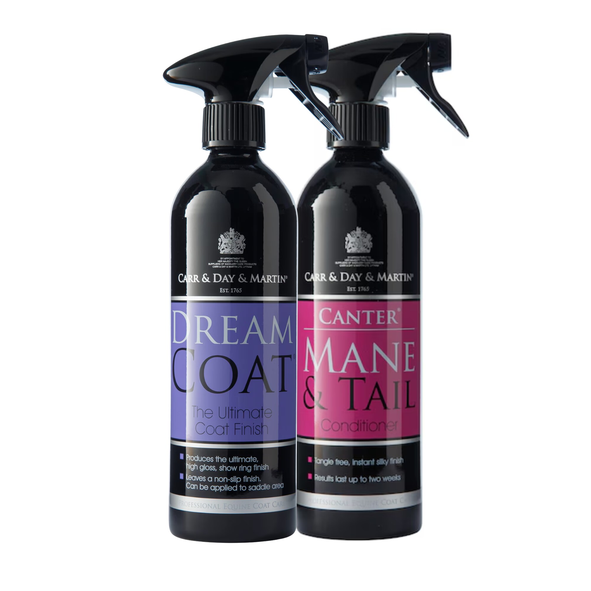 Give your horse a professional, gleaming finish with the Ultimate Grooming Duo from Carr & Day & Martin. This practical duo contains both Canter Mane & Tail and DreamCoat, two best-selling products that together provide maximum care and shine from mane to hoof. Ideal for riders who want silky, tangle-free hair and a high-gloss, non-greasy coat.