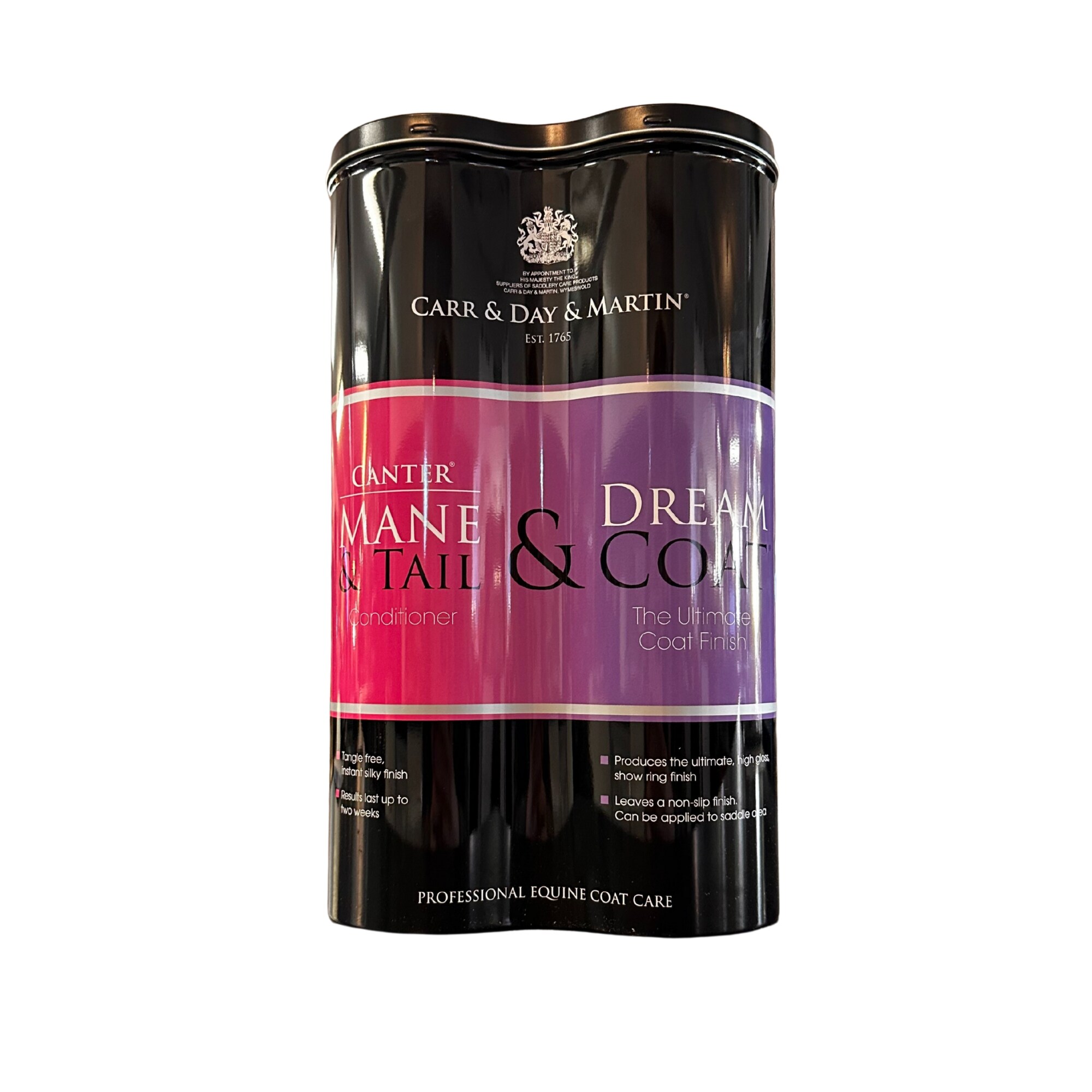 The Ultimate Grooming Duo contains one Canter Mane & Tail 500ml and one DreamCoat 500ml and is delivered in a practical metal box.