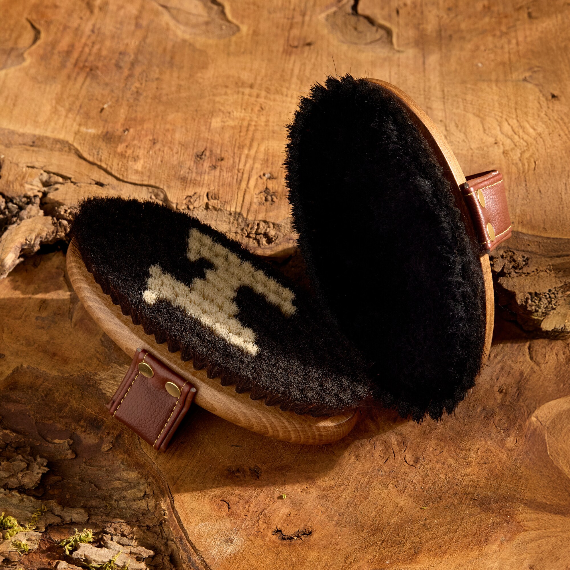 The brush features a balanced, handcrafted wooden base and a comfortable, water-resistant PU leather handle with elegant gold stitching and details, as well as an embossed Horseware logo for a sleek and premium look.