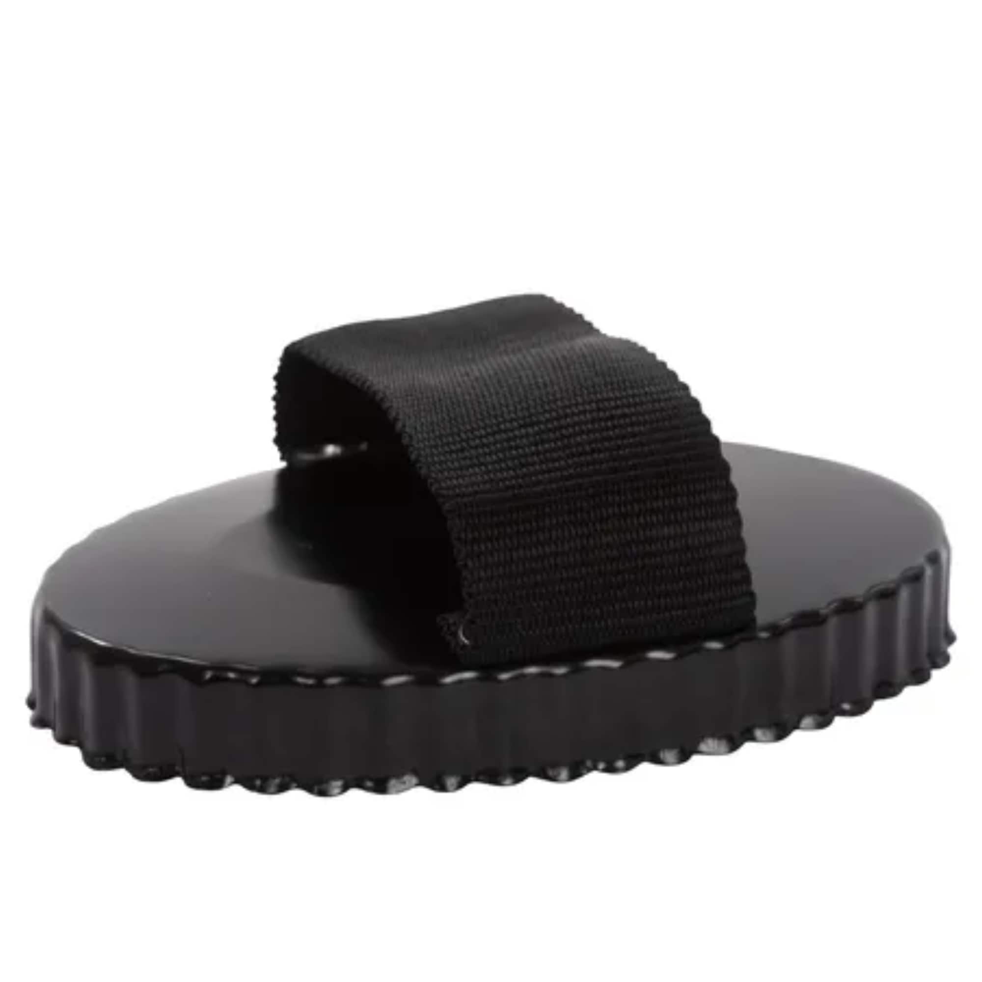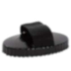 The curry comb is made from black metal and features a sturdy black handle that provides a secure grip and makes it comfortable to use.