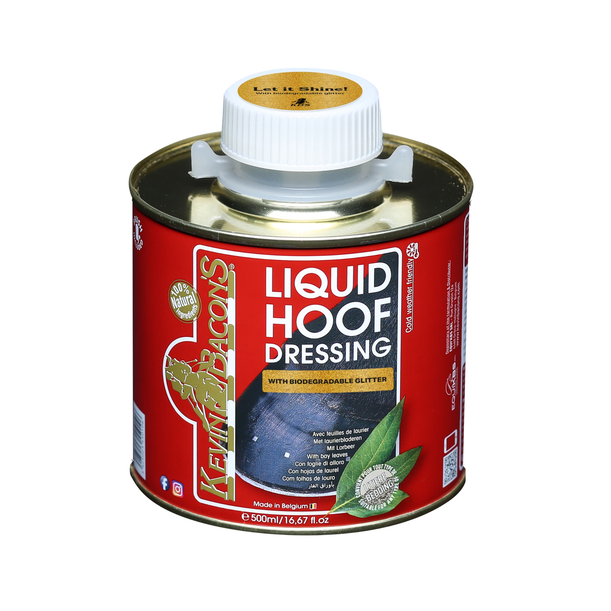 Kevin Bacon’s Hoof Dressing Oil is used to maintain the hoof’s natural strength, softness and elasticity, while providing a beautiful and long lasting shine. This hoof oil contains biodegradable golden glitter for an extra sparkling finish.