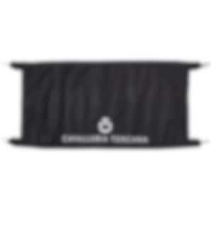 Black horse gate cover, neatly designed with a Cavalleria Toscana Logo in white embroidery. Four hooks makes it easy to hang up the gate cover in the doorway to the box.