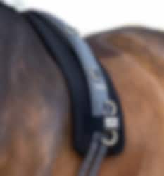Practical harness pad in a well-ventilated mesh material. The harness pad is black with velcro fasteners that hold both pad and girth in place. The harness pad is perfect to use under a lunging or a driving girth.