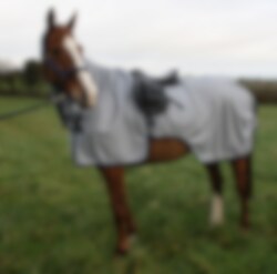 Perfect for hacking out, training or warming up in before a competition. Made of a soft lightweight and breathable mesh fabric. The Buzz-Off Riding rug is designed to fit around the saddle and rider’s legs and comes with a removable neck cover. The neck cover features a comfortable elasticated brow band that helps keep the rug in place during exercise. UV protection.