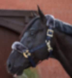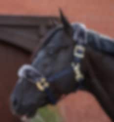 The halter is navy blue with faux fur in grey which gives a really nice contrast, gold colored buckles give an additional feeling of luxury. The halter is adjustable on both sides, allowing a custom fit and the throat strap snaps into a curved ring to prevent the snap hook from rubbing against the cheek.